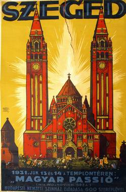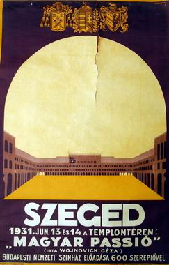 The idea was first proposed in 1926 by Gyula Juhász, a poet then living in Szeged. A number of renowned representatives of cultural and political life adopted the idea. The series of celebration programmes connected to the consecration of the Votive Church provided an opportunity to conduct a "public rehearsal" in the autumn of 1930. The superb acoustics of the church square surrounded by arcade appeared an excellent location for staging open air theatrical performances. The first performance - the Hungarian Passio - was presented on June 13, 1931. Since then, the performances of the open-air theatre have been the main success and attraction of each summer in Szeged. The success of the theatre came to an end with the second world war: the square became silent after the summer of 1939 for a period of 20 years.