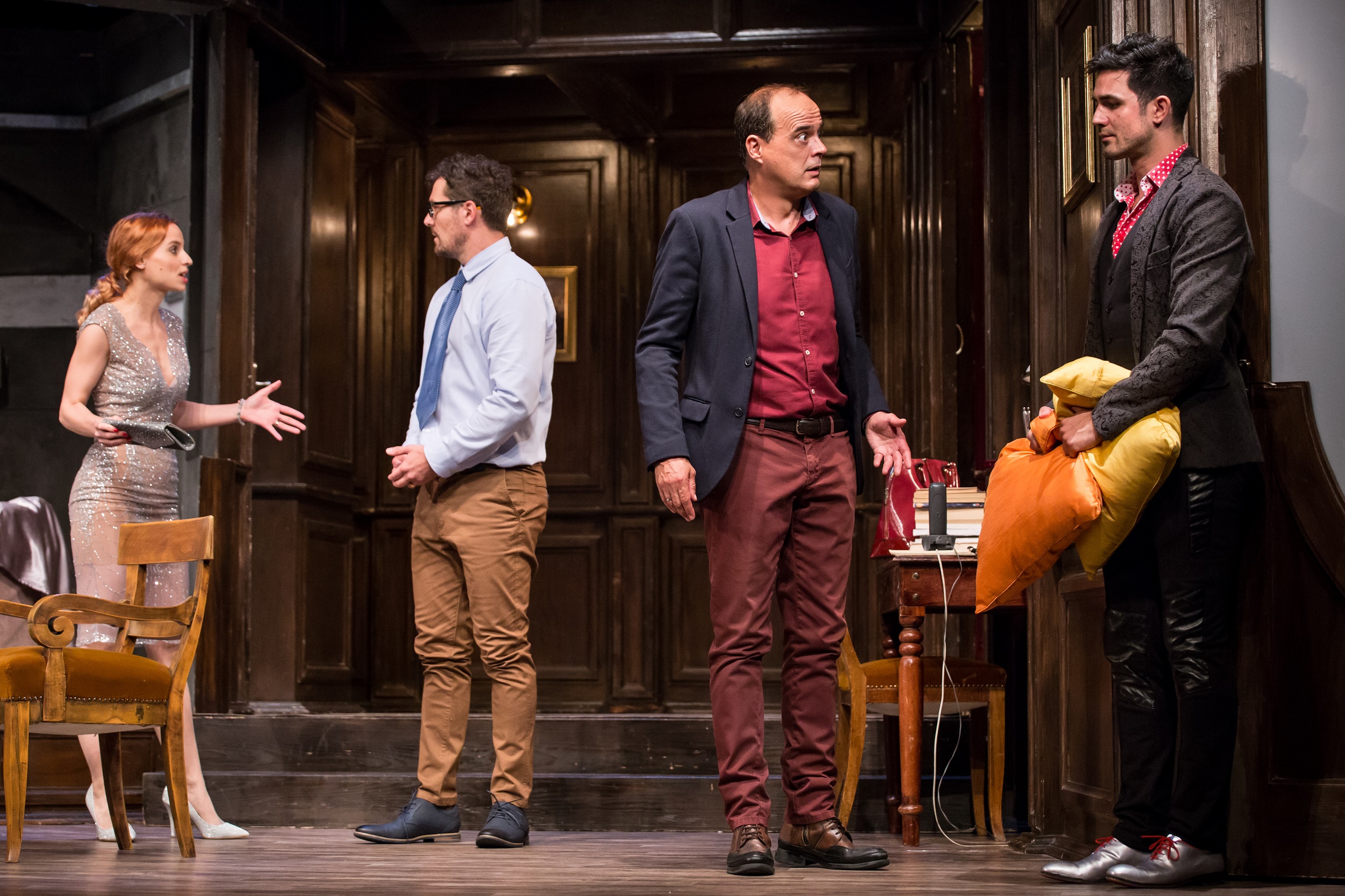 Az elegáns londoni emeleti lakás Philipé és Johannáé. Hetek óta tart a renoválás, nagy a felfordulás. Philip és Henry sikeres gyermekkönyv-kiadók, irodájuk a földszinten található. Henry nagy nőcsábász. Amíg Philip a feleségével vendégségbe készül, addig Henry egy hölgy ismerősével randizna társa lakásában. Nem tudja, hogy felesége is ezt tervezi újdonsült lovagjával. És van, amiről egyikük sem tud: a felújításon dolgozó belsőépítész is épp szerelmi légyottra hívta a szobalányt. A teljes káosz közepébe érkezik meg váratlanul a meglehetősen prűd hírében álló híres mesekönyvíró, akire a kiadó már régóta fente a fogát… Nem véletlenül nevezik Ray Cooney-t az angol Feydeau-nak. A közel ötven éve, 1969-ben írt vígjátékuk folyamatosan szerepel a világ színházainak műsorán. Ez sem véletlen.